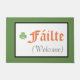 Fáilte (Irish/Gaelic) mean Welcome! Text, Celtic style shamrock and colours of Ireland flag.