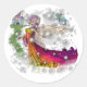 Beautilful fairy princess walking up a grass path to her castle with a knight in shining armour just over her shoulder riding to meet her there, done with an overlay on semi-transparent mystical bubbles