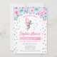 Fairy First Birthday Party Invitation. Cute design in faux glitter silver with floral accent. Invite card with glitter fairy silhouette stars and script font. Purple, lavender pink, teal and white. Perfect for a magical 1st bday celebration.