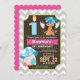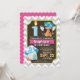 Cute pink and blue fairy invitation invitation for girl. Invite features grey and white chevron pattern, blue mushroom house, and pink back.
