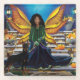 A fairy with orange and yellow wings sitting on stone steps that lead to perhaps the Fairy realm. The African American Fairy is not alone, she is with her guardian doberman dog on this Autumn Day.