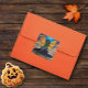 A fairy with orange and yellow wings sitting on stone steps that lead to perhaps the Fairy realm. The African American Fairy is not alone, she is with her guardian doberman dog on this Autumn Day.