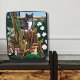 Grey tom cat perched on a fairy house made of a tree stump. Fairy playing a flute and a mouse outside knitting in her chair all surround the cat.
