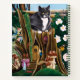 Grey tom cat perched on a fairy house made of a tree stump. Fairy playing a flute and a mouse outside knitting in her chair all surround the cat.