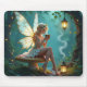 A beautiful mouse pad featuring a fairy sitting on a msurhoom in an enchanted forest being lit up by lanterns drinking a warm cup of coffee.