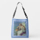 This all over print body cross over bag is blue with a fairy in a white gown with white wings sitting on a cliff holding a harp beside a lit candle with ornate white border on the front and back.