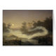 A fine art image of multiple fairies in white mist flying over water. Landscape setting with night sky and forest as a backdrop. Painting by August Malmstom
