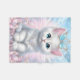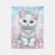 An adorable fairy princess white kitten with jewels, pink flowers and fairy wings on a sparkly blue background.