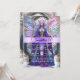 A beautiul fairy princess has her iridescent fairy wings open wide and is standing against a magical portal door. She is wearing a long blue and purple robe edged with faux gold and a bustier. Her long silver white hair cascades down around her shoulders. Her hands are stretched out and the palms of her hands are facing up. White text templates appear below her for your custom wording and a faux shiny purple band has black templates. The back has the same graphic with an extra text template for additional wording or information that you may want to convey to your guests (directions, accommodation etc). Should it not be required, simply delete the wording to leave it blank. This waterolor comic graphic is ideal for a witch party; a Halloween theme celebration; a girls fairy fairytale or a magic themed birthday.