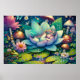 Cute little fairy sleeping on a lotus flower on a lily pad with flowers and mushroom background. Cute fairytale style illustration.