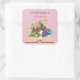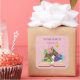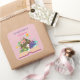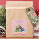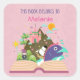 A customisable bookplate sticker in pink with a fairy tale theme shows a book with castles, pirate ships, purple fish and other fantasy symbols.
