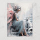 A fairy sits on the stairs with her white cat a paining in minimal colours