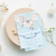 Horse-themed birthday invitation featuring illustration of a lovely baby white magic horse and Watercolor fairytale gold stars with pastel colours balloons and blue ribbon for celebration!