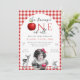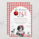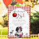 Fairytale Princess Fairest One Of All 1st Birthday Invitation – Inspired by the classic Grimm's fairytale Little Snow White, this enchanting invitation is perfect for your little princess’s first birthday celebration. Featuring a rustic red and white gingham pattern background, a young girl with dark hair and rosy cheeks holds an apple, surrounded by woodland creatures like a baby deer and rabbit in vintage black and white. The invitation reads “The Fairest ONE of All” with an apple as the O, in a charming mix of script and bold red block font. Ideal for a fairytale-themed birthday or a Snow White princess party. Available in both printed and eco-friendly digital download formats, perfect for sharing via text, email, or social media.