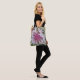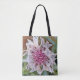 The front of the tote features a beautiful lavender-pink toned Bachelor's Button flower, processed in an artsy style; the back of the tote has a complementary colour toned floral pattern with a bible verse from 1 Chronicles 16:10, so either side can be shown.