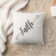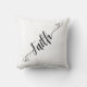 The Faith & Hearts Pillow features a minimalistic design that includes the word "Faith," which has curly lines on the beginning and end of the word. The curly lines include some small hearts as an added flourish.
