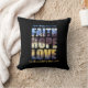 Inspirational pillow with typography sunset design. Text says "Three things last forever. Faith, Hope Love, and the greatest of these is love." (It is a paraphrase of the conclusion of First Corinthians 13 in the New Testament of the Bible.)