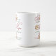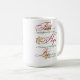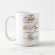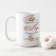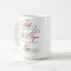 This customisable red, green, white, and gold FAUX glitter (PRINTED) snowflakes Christmas mug has ornate red and green words on it that say "Faith in a baby who brings love, life, and light, hope in His promise of everlasting peace, love in the embrace of family and friends."
