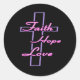 Faith Hope Love in pretty pink resting on a purple cross. The word Faith centre on the cross for inspiration..