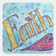 The word "Faith" is painted in a soft golden yellow against dappled soft blue background. A large pink and purple heart underscores and supports the text of "Faith". The large heart is reinforced by the small pink heart dotting the "i" in "Faith". The watercolor painting has a textural contrast and sparkle from a light layer of glitter.