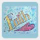 The word "Faith" is painted in a soft golden yellow against dappled soft blue background. A large pink and purple heart underscores and supports the text of "Faith". The large heart is reinforced by the small pink heart dotting the "i" in "Faith". The watercolor painting has a textural contrast and sparkle from a light layer of glitter.