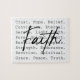 Set against a white background, this jigsaw puzzle features the word “faith” in flowing script that stretches confidently across the center. Behind it, filling the space beneath the main word, are lowercase typewriter-style words—each one a reflection of faith’s many facets. Words like trust, hope, peace, truth, and belief stand out in uniform rows, creating a textured backdrop of conviction and clarity. The layered typography creates both contrast and cohesion. It's a visual meditation on what faith is made of—simple, striking, and quietly powerful.