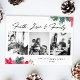 Religious Christmas Holiday script card "Faith Love and Family" with collage of photo and watercolor pink floral poinsettia and pine branch.