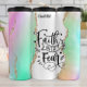 This elegant graphic prominently features the powerful message "Faith over Fear" in stylish black script. The uplifting text is beautifully set against a vibrant abstract background of soft pink, purple, blue, and green watercolor hues. Streaks of shimmering gold glitter divide the colours vertically, creating an ethereal and inspiring spiritual design.