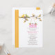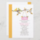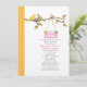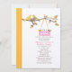 A modern stylish baby shower invitation featuring an illustration of a yellow mummy bird with a green daddy bird perched on a tree branch with autumn leaves. The birds are watching over their nest, which holds a pink egg. Orange border with white dots at left. Personalise the text with details of your occasion.