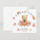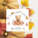 "Thank you". Celebrate with this teddy bear themed baby shower party! Watercolor cute teddy bear with an autumn pumpkin in its paws sits on autumn foliage.