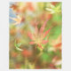 Against the backdrop of green summer leaves of a Japanese maple flushing to autumn reds and yellows, a rose and gold skeleton leaf drifts slowly down to the ground.