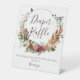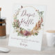This is a rustic and boho diaper raffle baby shower pedestal sign, using a bohemian autumnal watercolor floral and botanical wreath design. The colour palette features rich fall colours such as burgundy, burnt orange, terracotta, deep green, berry and gold. This would be perfect for a rustic or fall themed baby shower and would also perfectly match the other items in the collection for a beautiful and elegant autumn baby shower.