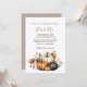 This elegant custom invitation features a Fall floral theme with pumpkins. A watercolor image of four different coloured pumpkins is placed at the bottom. They're accented with a bouquet of dried flowers in beautiful Autumn colours. It's perfect for a bridal shower, birthday party, wedding, or any other cosy Fall celebration.