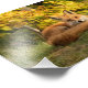 A cute young fox calmly peers from its grassy resting place with a background of autumn colour.