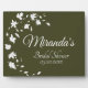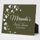 Pretty and modern bridal shower design features a spray of white flowers and white customisable text on Autumn green background