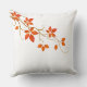 This throw pillow is shown in a autumn fall leaves and pumpkin print with a white background colour.