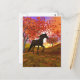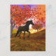 Postcard with my computer artwork of a galloping brown horse in a windy autumn day with blowing fall maple leaves.