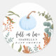 Cute baby shower favour sticker featuring illustration of blue pumpkin with autumn botanicals. The text says "fall in love." Perfect for a boy's shower.