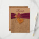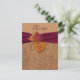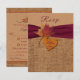 This affordable and eye-catching wedding RSVP card has a simulated burlap texture background, Kraft paper look text area trimmed in wine and orange with a burgundy wine ribbon image running across the top of the response card with a cluster of autumn leaves and a small simulated wood heart in gold with burgundy lettering that says, "Fall in Love" on it. RSVP details, along with meal options are printed on the back in a mix of wine and orange. There is also a smaller size RSVP card without meal choices. If you need additional matching items, please email your request to niteowlstudio@gmail.com or use the Zazzle chat feature to get in touch.
