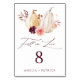 This wedding table number features watercolor white and yellow pumpkins adorned with burgundy, maroon, and blush pink flowers over fall leaves. For more advanced customisation of this design, please click the BLUE DESIGN TOOL BUTTON above