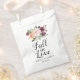 Wedding favour bag design features "Fall in Love" script text with a custom monogram accented by a bouquet of beautiful roses, dahlias, peony flowers, and greenery, in a gorgeous autumn palette of burgundy red, golden yellow, peach orange, blush pink, and shades of green.