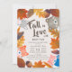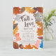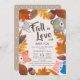 This cute and rustic "fall in love" gender neutral baby shower invitation features a light beige background surrounded by autumn/fall leaves with woodland animals which are fox, bunny, bear, and red panda. The reverse side features a light brown background with white polka dots. Personalise it for your needs. You can find matching products at my store.