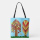 This tote bag has an art deco design of trees coloured for fall made of various shapes on a field of blue.