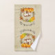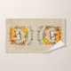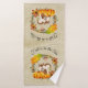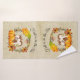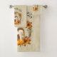 A bath towel set with a typography design which says Fall is in the air. Illustrated with an adorable squirrel standing behind some orange watercolor pumpkins. A decorated foliage wreath surrounds them with an oak leaf, an acorn, autumn orange flowers and other sprigs and leaves. Background is a light brown vintage grunge texture/image.