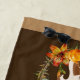 A beach towel with a typography design which says Fall is in the air. Illustrated with an adorable squirrel standing behind some orange watercolor pumpkins. A decorated foliage wreath surrounds them with an oak leaf, an acorn, autumn orange flowers and other sprigs and leaves.