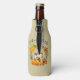 Bottle cooler with a typography design which says Fall is in the air. Illustrated with an adorable squirrel standing behind some orange watercolor pumpkins. A decorated foliage wreath surrounds them with an oak leaf, an acorn, autumn orange flowers and other sprigs and leaves.