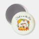 A magnet with a typography design which says Fall is in the air. Illustrated with an adorable squirrel standing behind some orange watercolor pumpkins. A decorated foliage wreath surrounds them with an oak leaf, an acorn, autumn orange flowers and other sprigs and leaves. Background is a vintage looking off-white with aged light brown edges.