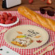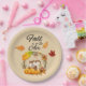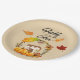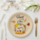Typography design which says Fall is in the air. Illustrated with an adorable squirrel standing behind some orange watercolor pumpkins. A decorated foliage wreath surrounds them with an oak leaf, an acorn, autumn orange flowers and other sprigs and leaves.