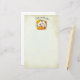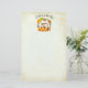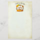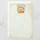Stationery with a typography design which says Fall is in the air. Illustrated with an adorable squirrel standing behind some orange watercolor pumpkins. A decorated foliage wreath surrounds them with an oak leaf, an acorn, autumn orange flowers and other sprigs and leaves. Background is a vintage looking off-white with aged light brown edges.