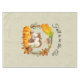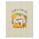 Tablecloth with a typography design which says Fall is in the air. Illustrated with an adorable squirrel standing behind some orange watercolor pumpkins. A decorated foliage wreath surrounds them with an oak leaf, an acorn, autumn orange flowers and other sprigs and leaves.  background is a cream colour with black speckles.